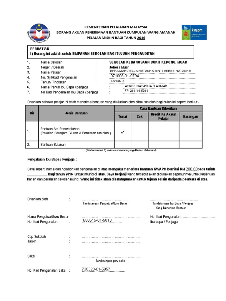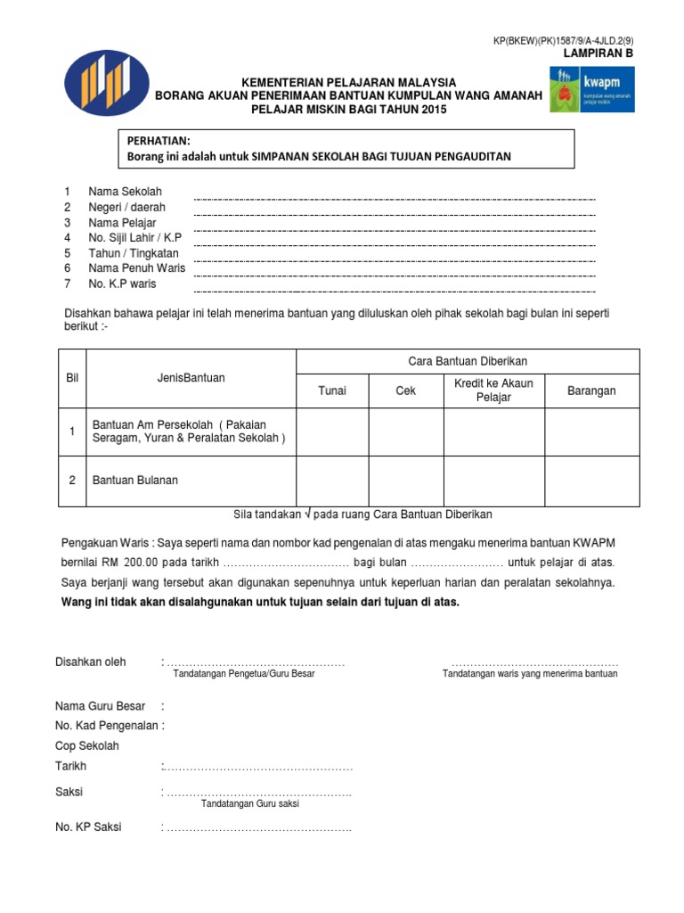 Borang Akuan Penerimaan Bantuan Kumpulan Wang Amanah Pelajar Miskin Borang 9 untuk jenis sdnLampiran 1 borang pemantauan pengagihan peruntukan bantuan kumpulan wang amanah pelajar miskin kwapm ekasih bagi negeri sarawak bayaran bil murid bayaran bayaran bb jumlah tarikh cek bil murid bb miskin tarikh pembayaran. JABATAN PERKHIDMATAN PELAJAR UNIVERSITI KEBANGSAAN MALAYSIA BORANG AKUAN TERIMA WANG No. Mohd Riduan bin Mohd Fadzlan Created Date.