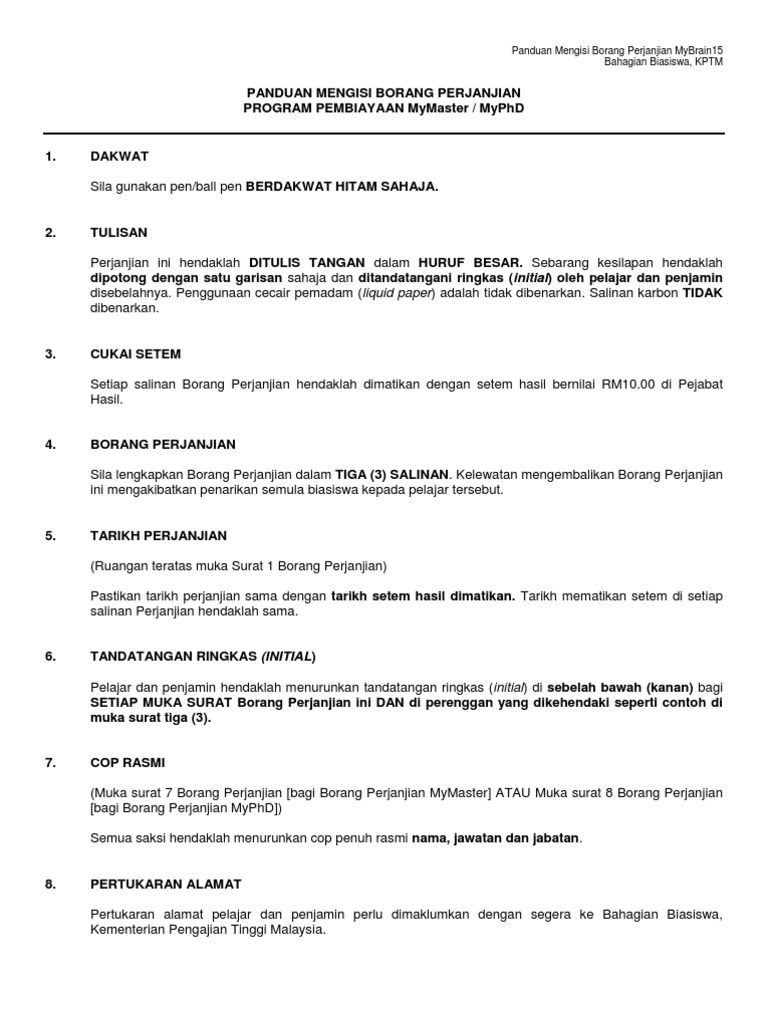 Panduan Mengisi Borang Perjanjian MyBrain15 Bahagian Biasiswa KPT PANDUAN MENGISI BORANG PERJANJIAN PROGRAM PEMBIAYAAN MYMASTER MYPHD 1. 2005 32 Isikan semua maklumat dengan jelas tepat dan lengkap mengikut butiran yang dikehendaki seperti dalam borang. Penolong Pegawai Pembangunan Masyarakat Gred S29 3.