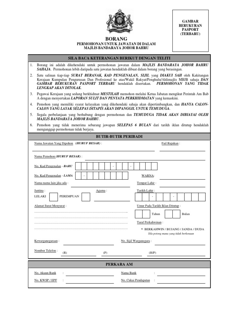 Borang permohonan kerja mbjb. Permohonan Jawatan Kosong di Majlis Bandaraya Johor Bahru MBJB dialukan memohon dan mempelawa kepada Warganegara Malaysia yang berkelayakan dan berumur tidak kurang dari 18 tahun pada tarikh tutup iklan jawatan untuk mengisi kekosongan jawatan tetap kontrak seperti berikut -. Panduan Kerja Sektor Awam. B Permohonan daripada pegawai-pegawai yang sedang berkhidmat mestilah membuat permohonan.