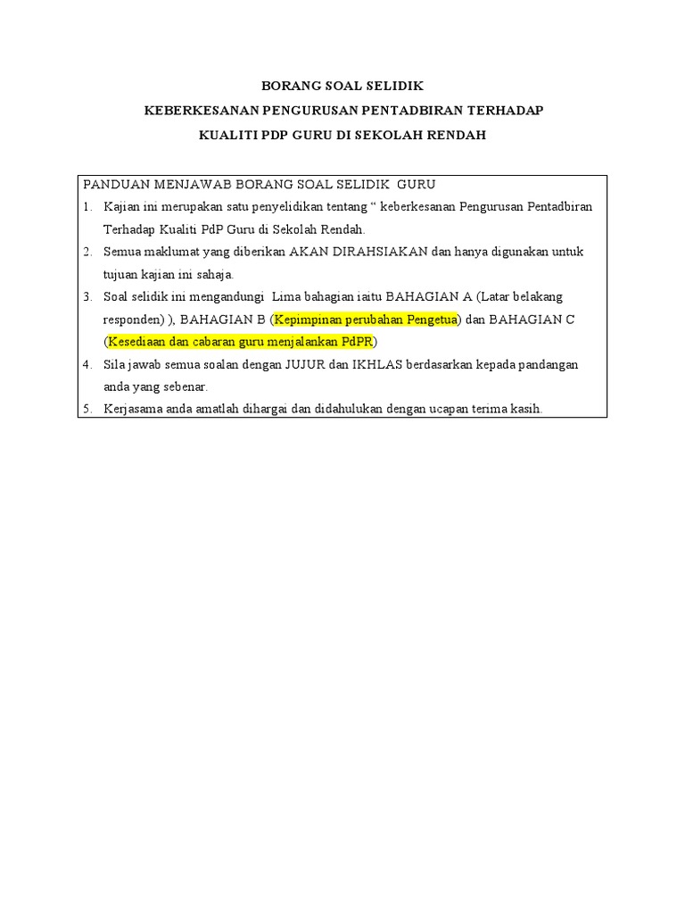 Borang Kaji Selidik 2. BORANG SOAL SELIDIK PERSEPSI GURU-GURU TERHADAP KONSEP SEKOLAH BESTARI PENGENALAN Borang soal selidik ini digunakan untuk membuat kajian terhadap persepsi guru-guru tentang konsep sekolah bestari yang diilhamkan oleh Kementerian Pelajaran Malaysia. Borang Soal Selidik Kepuasan Kerja Guru Pdf.