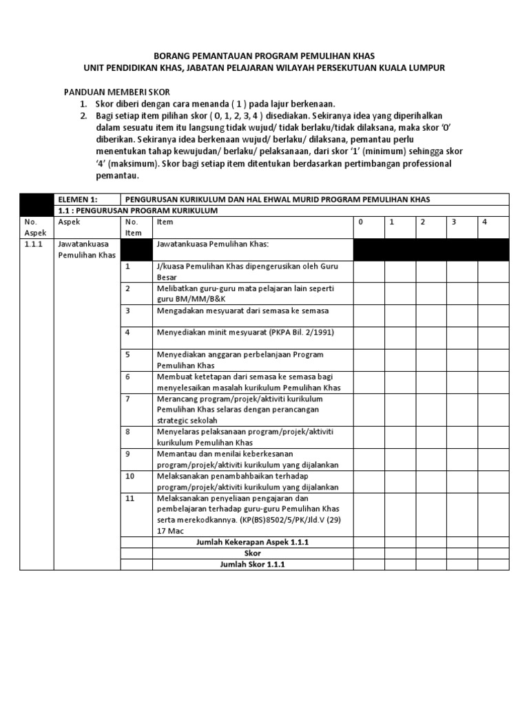 Borang Pemantauan Pengurusan Pelaksanaan Kurikulum Di Sekolah