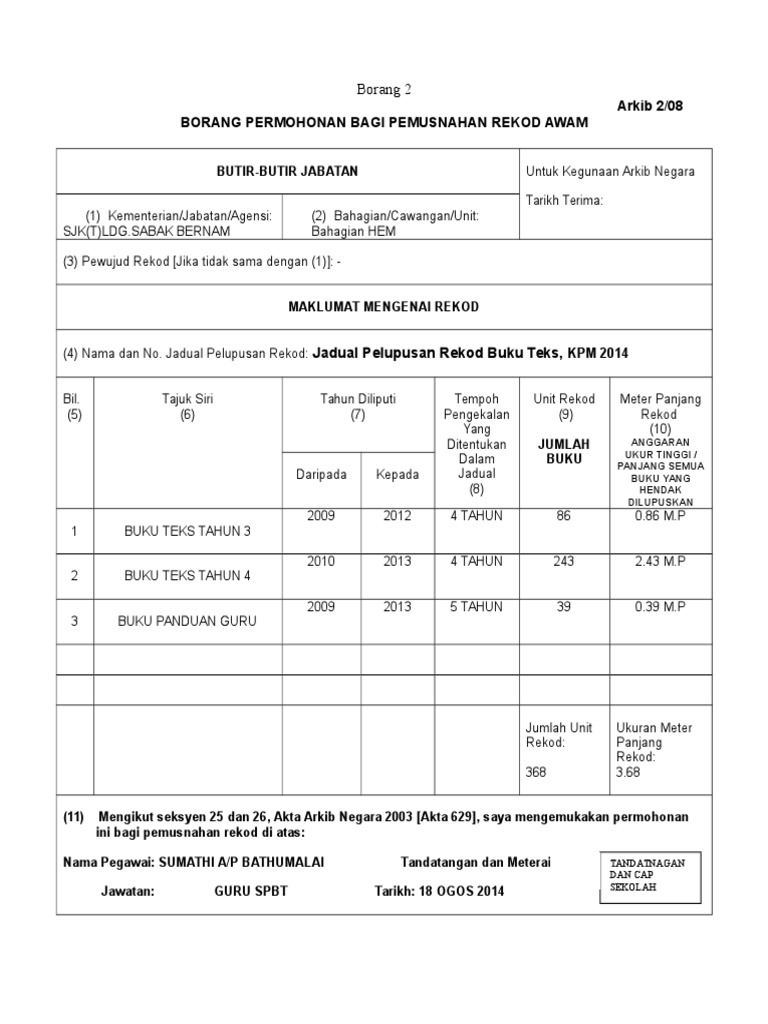 Tandatangan dan MeteraiCap Jabatan. Sekolah menghantar satu 1 salinan Borang Penentusahan Pemusnahan Rekod Awam Arkib 1208ke JPN untuk dipanjangkan ke a t. Unit Rekod 9 Meter Panjang Rekod 10 Daripada Kepada.