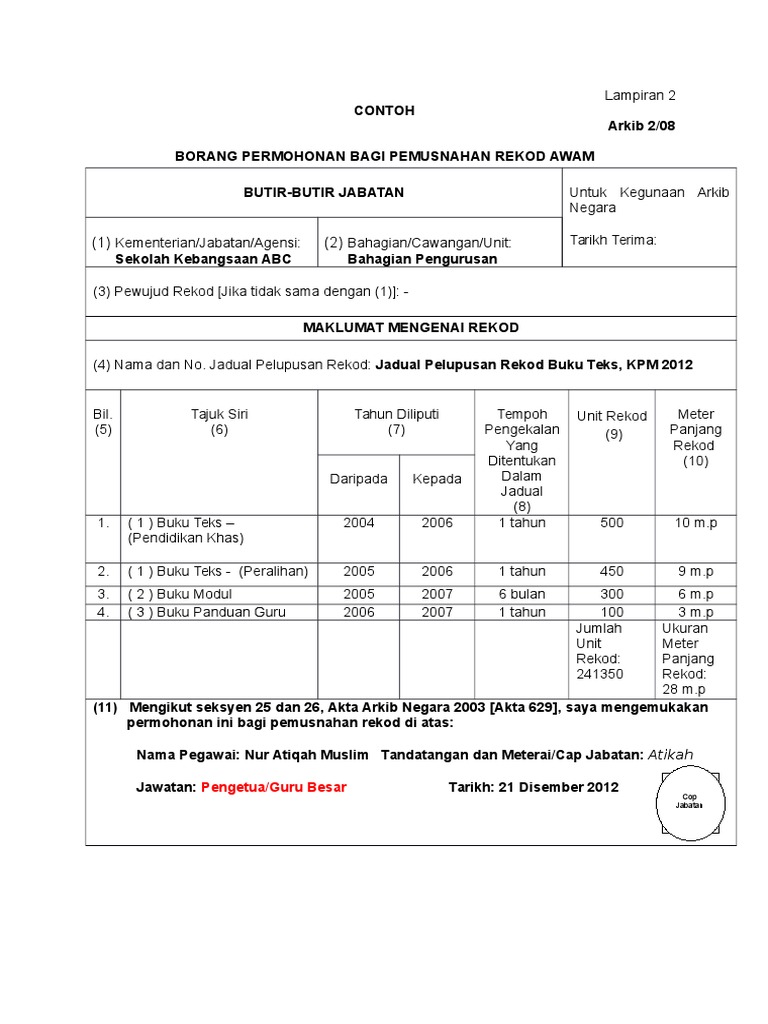 Contoh isi borang penentusahan pemusnahan rekod awam. BAHAGIAN IV pELUPUSAN REKOD 311 Pejabat awam dikehendaki melengkapkan Borang Penentusahan Pemusnahan Rekod Awam Borang Arkib 1208 dan Borang Penentusahan Pemusnahan Rekod Kewangan dan Perakaunan Borang Kewangan Arkib 1308 dalam tempoh satu 1 bulan dari tarikh pemusnahan dilaksanakan. Penentusahan pemusnahan rekod awam Arkib_Negara_Malaysia. Sebagai contoh Kod Siri 13 Kes adalah amat sesuai digunakan untuk fail kakitangan dan fail-fail individu.