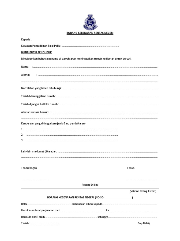 PDRM BORANG RENTAS NEGERI PDF. DOWNLOAD BORANG RENTAS NEGERI TERKINI. Memang tengah panas sekarang ni search keyword berkaitan dengan cara mohon perlepasan kebenaran polis PDRM melalui borang permit rentas negeri dan download muat turun surat borang kebenaran rentas negeri atau daerah PKP PKPB dan PKPP.